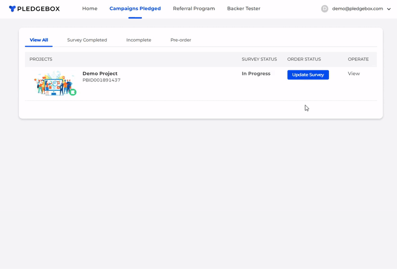 Click the “View” button on the Campaign Pledged page and Update your survey information.