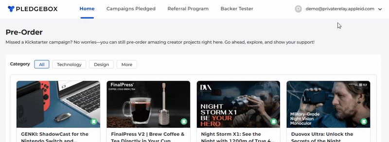 If you opted to hide your email address when signing up with Apple, project creators will only be able to see your private relay email in their backer report at the end of the campaign.
