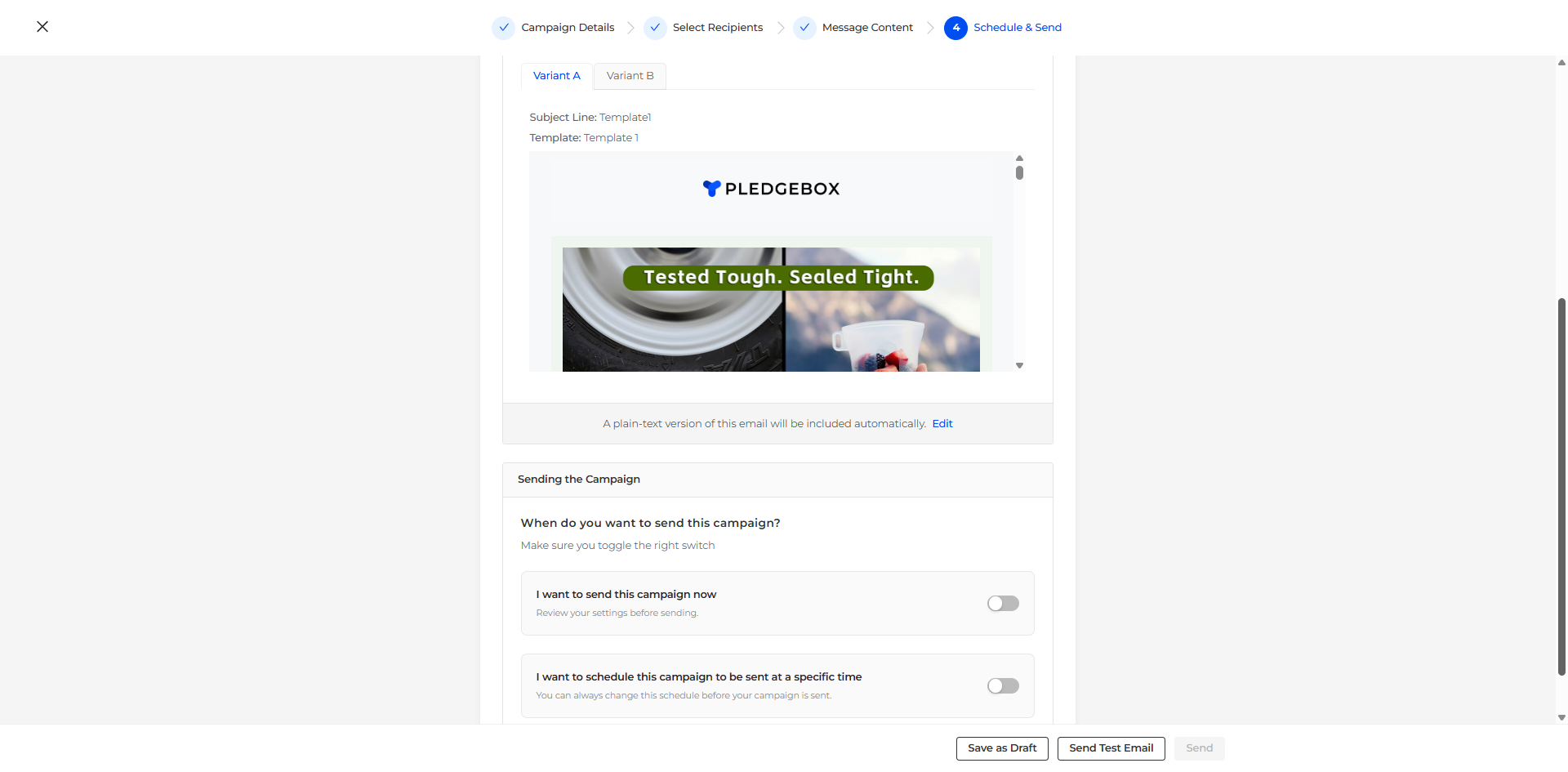 4. Review the email for each variant and choose when to send: Send now, or Schedule for later