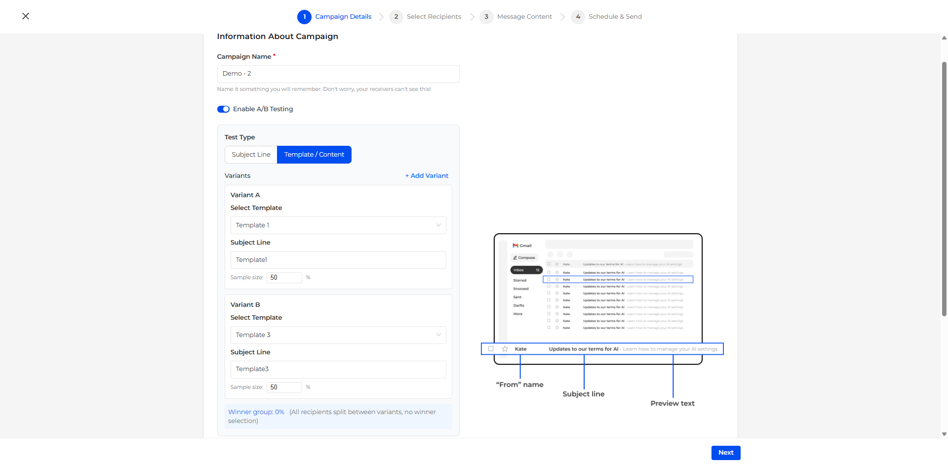 - For each variant, select a Template, set the Subject Line, and assign the Sample size.