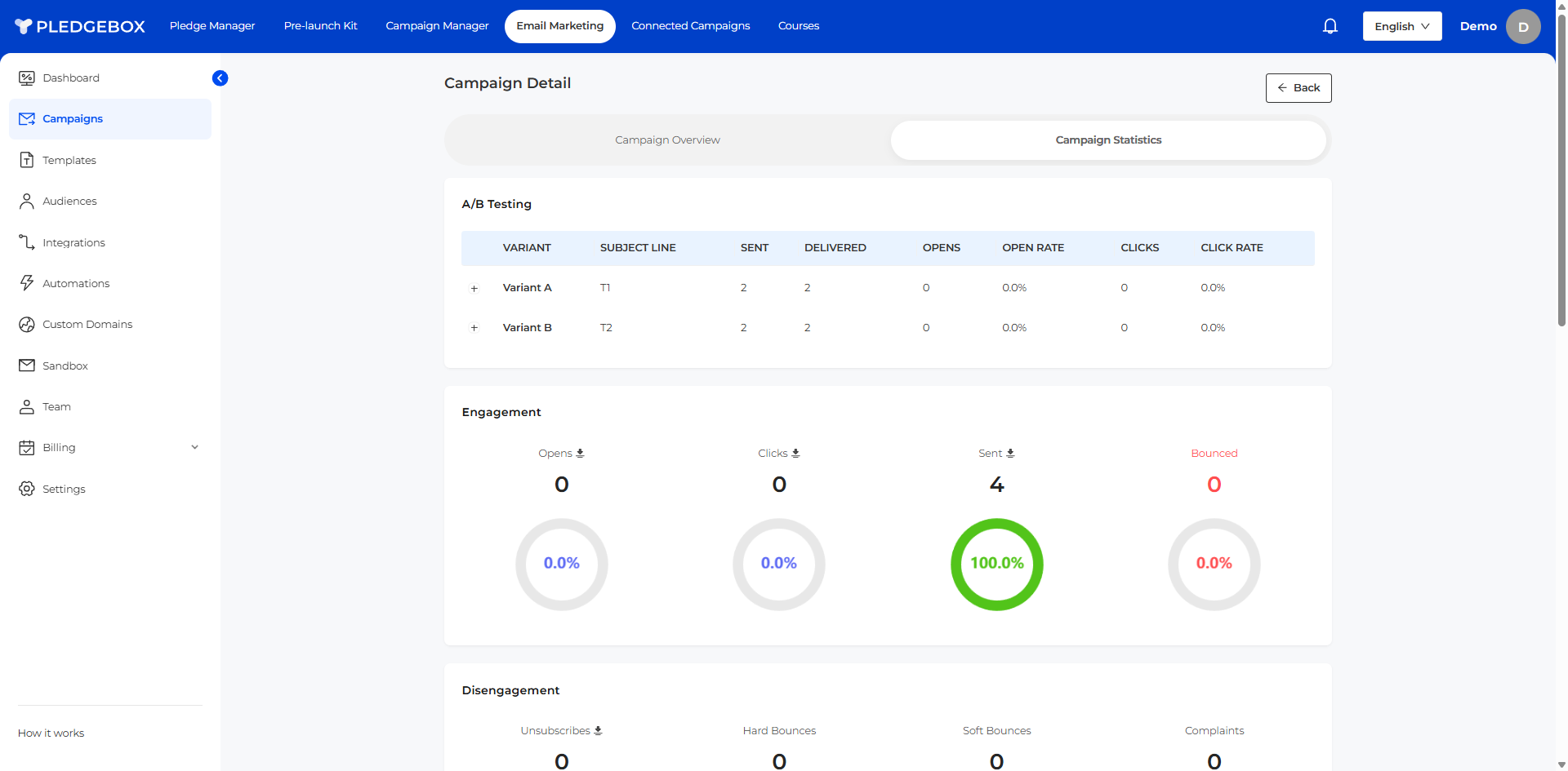 In A/B Testing, you can compare each variant’s key metrics (e.g., sent, delivered, opens, clicks, open rate, click rate).