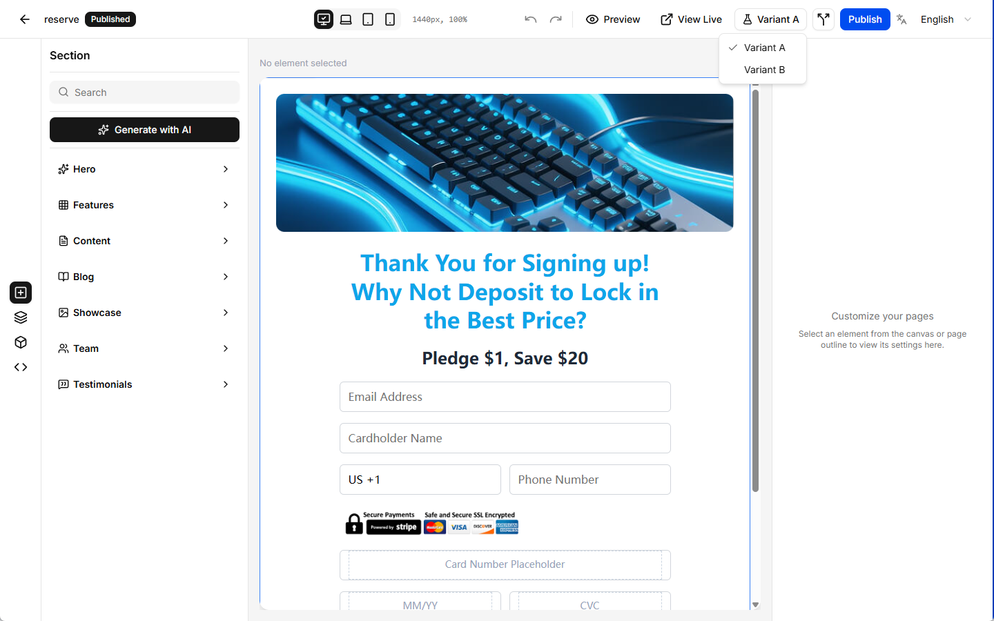 Before setting up an A/B test, you need to create at least one landing page. Go to the Landing Page section and design your base page.