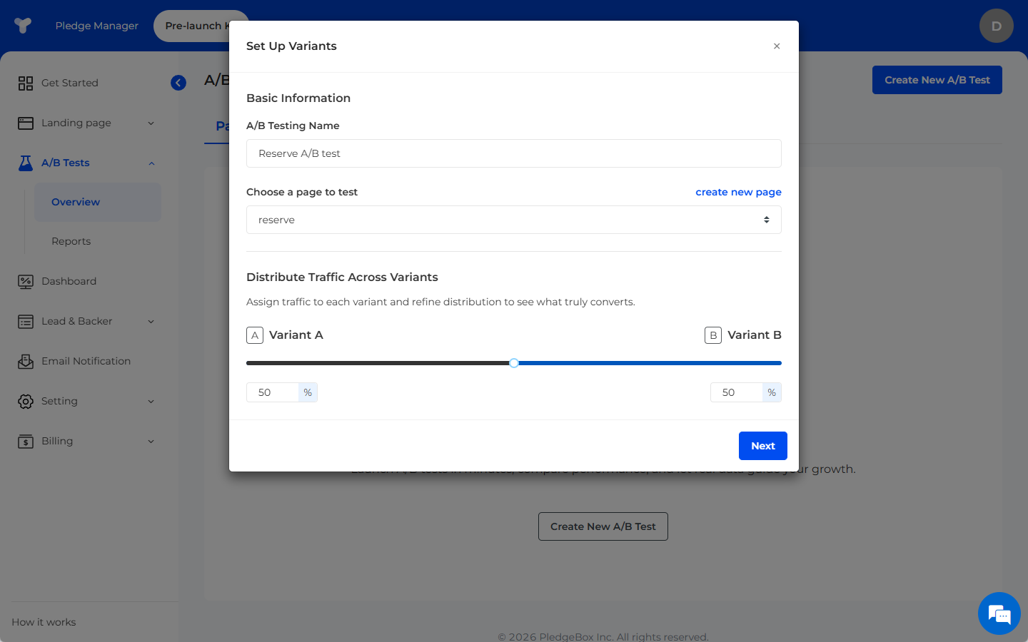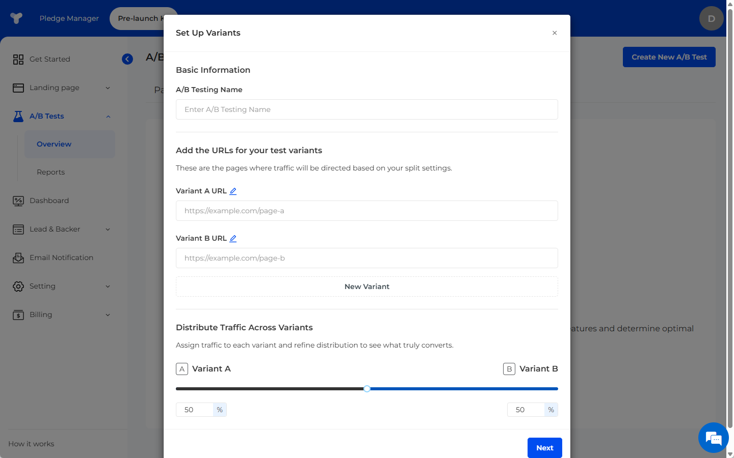 Distribute Traffic Across Variants: Set the percentage of traffic each page should receive.