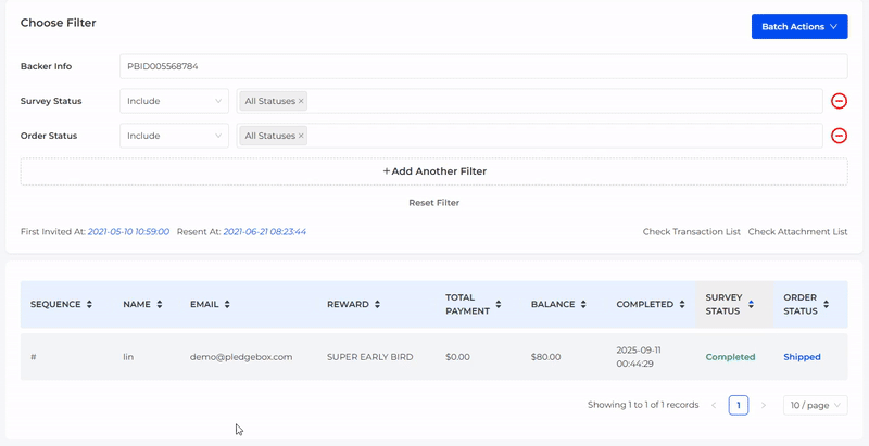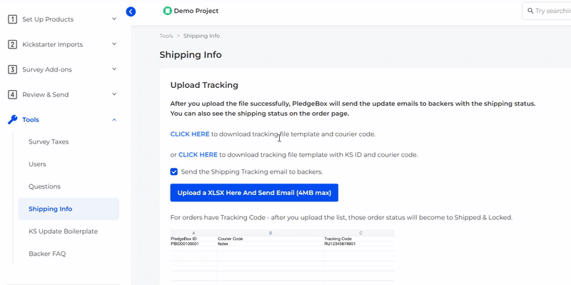 PledgeBox supports creators to upload tracking code to backers after sending out the survey, and synchronize shipping progress to backers via email notification.