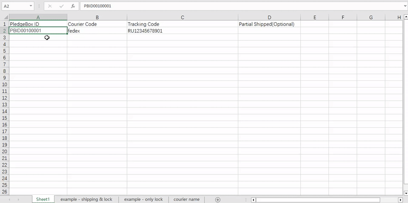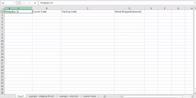3) Please fill in PledgeBox ID (PBID), Courier Code(check ‘courier name’ sheet in the file template) and Tracking Code.
