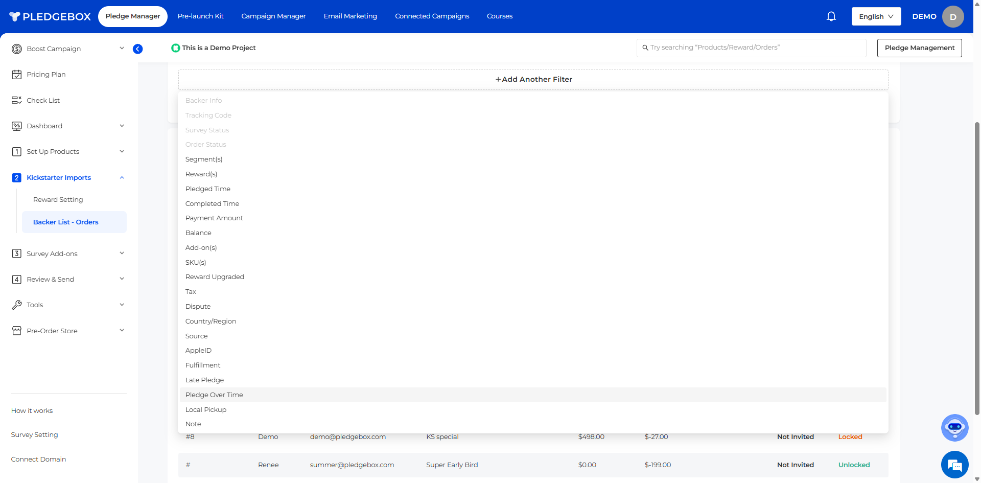 PledgeBox supports you to filter out the orders by various filter conditions. 1) Backer Info 2) Survey Status 3) Order Status 4) Segment(s) 5) Rewards 6) Pledged Time 7) Complete Time 8) Payment Amount 9) Balance 10) Add-on(s) 11)SKU(s) 12)Reward ...