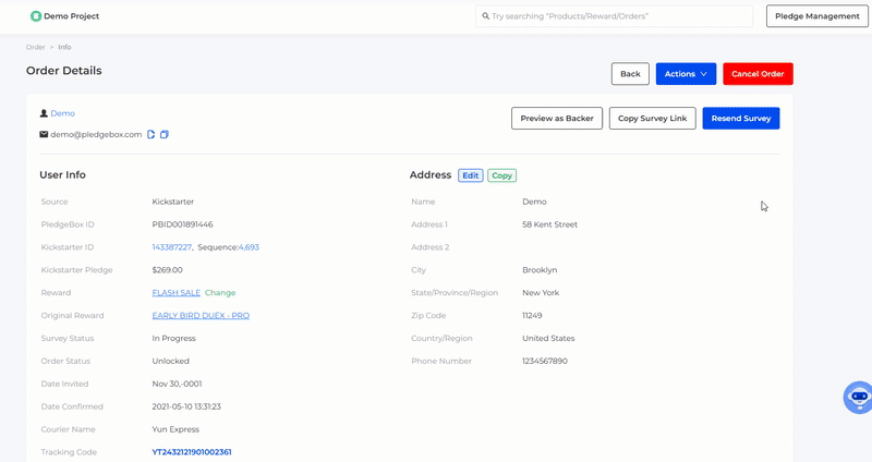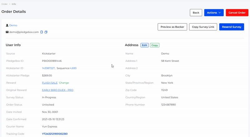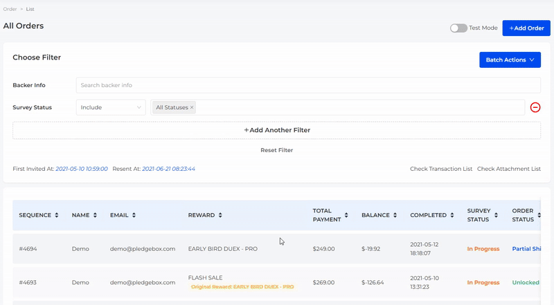 You can review the order information on this page. Including order status (unlocked、locked、shipped、refunded and upgraded), survey status (not invited、pending、in progress、completed、canceled and dropped), address, reward, backer’s email. You can change reward, lock/unlock the order, update shipping info, generate invoice, edit address, resend individual survey, preview as backer, and copy the survey link.